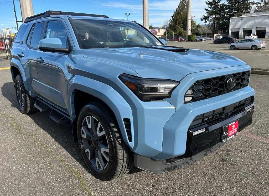 - Gloss-black honeycomb-style grille; color-keyed mirror caps, door handles, overfenders, and rear spoiler; black "trd sport" and "4runner" badges.