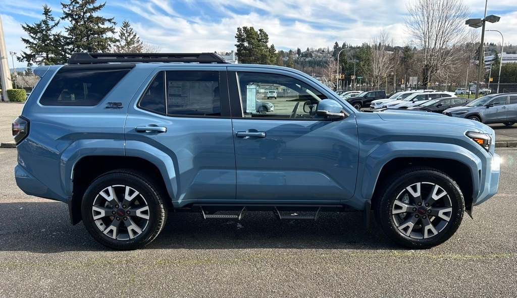 15 Speakers, 4-Wheel Disc Brakes, 4Runner All Weather Cargo Tray (TMS), 4Runner All Weather Floor Mats (TMS), ABS brakes, Air Conditioning, Alloy wheels, AM/FM radio: SiriusXM, Anti-whiplash front head restraints, Apple CarPlay/Android Auto, ARB Platform 3/4 Length Roof Rack (TMS), Auto High-beam Headlights, Automatic temperature control, Badge Inserts, Rear TOYOTA Matte Black(TMS), Brake assist, Bumpers: body-color, Connected Services Trial Offering (TMS), Driver door bin, Driver vanity mirror, Dual front impact airbags, Dual front side impact airbags, Electronic Stability Control, Emergency communication system: Safety Connect (1-year trial), Exterior Parking Camera Rear, Front & Rear Molded Black 4Runner Mudguards (TMS), Front anti-roll bar, Front Bucket Seats, Front Center Armrest, Front Color Keyed Door Edge Guards (TMS), Front dual zone A/C, Front fog lights, Front Illuminated Dark Chrome Badge (TMS), Front reading lights, Front wheel independent suspension, Heated & Ventilated Front Bucket Seats, Heated door mirrors, Heated front seats, Illuminated entry, Intelligent Inside Rear View Mirror, Interior D-Pillar Cargo Lights (TMS), Interior Gray Door Panel Protectors (TMS), Knee airbag, Leather Shift Knob, Leather steering wheel, Low tire pressure warning, Memory seat, Moonroof, Navigation System, Occupant sensing airbag, Outside temperature display, Overhead airbag, Overhead console, Panic alarm, Passenger door bin, Passenger vanity mirror, Power door mirrors, Power driver seat, Power passenger seat, Power steering, Power windows, Predator Drop Black Side Steps (TMS), Radio: 14" Audio, Rear anti-roll bar, Rear seat center armrest, Rear side impact airbag, Rear window defroster, Rear window wiper, Remote keyless entry, Security system, SiriusXM Trial Offering: 33 Months (TMS), SofTex Seat Trim, Speed control, Speed-sensing steering, Split folding rear seat, Spoiler, Steering wheel mounted audio controls, Tachometer, Telescoping steering wheel, Tilt steering wheel, Traction control, TRD Sport Premium, Trip computer, Variably intermittent wipers, Ventilated front seats, Wheels: 20" Dark-Gray Painted Alloy.2025 Toyota 4Runner TRD Sport Premium Blue 4WD 8-Speed Automatic 2.4L 4-Cylinder