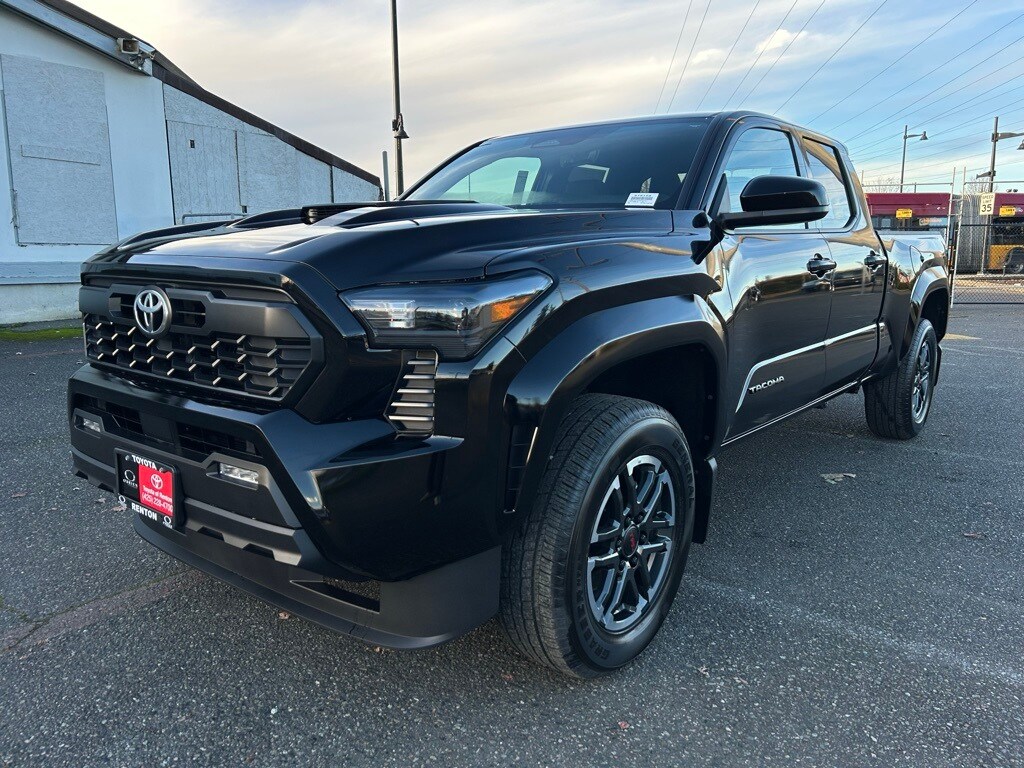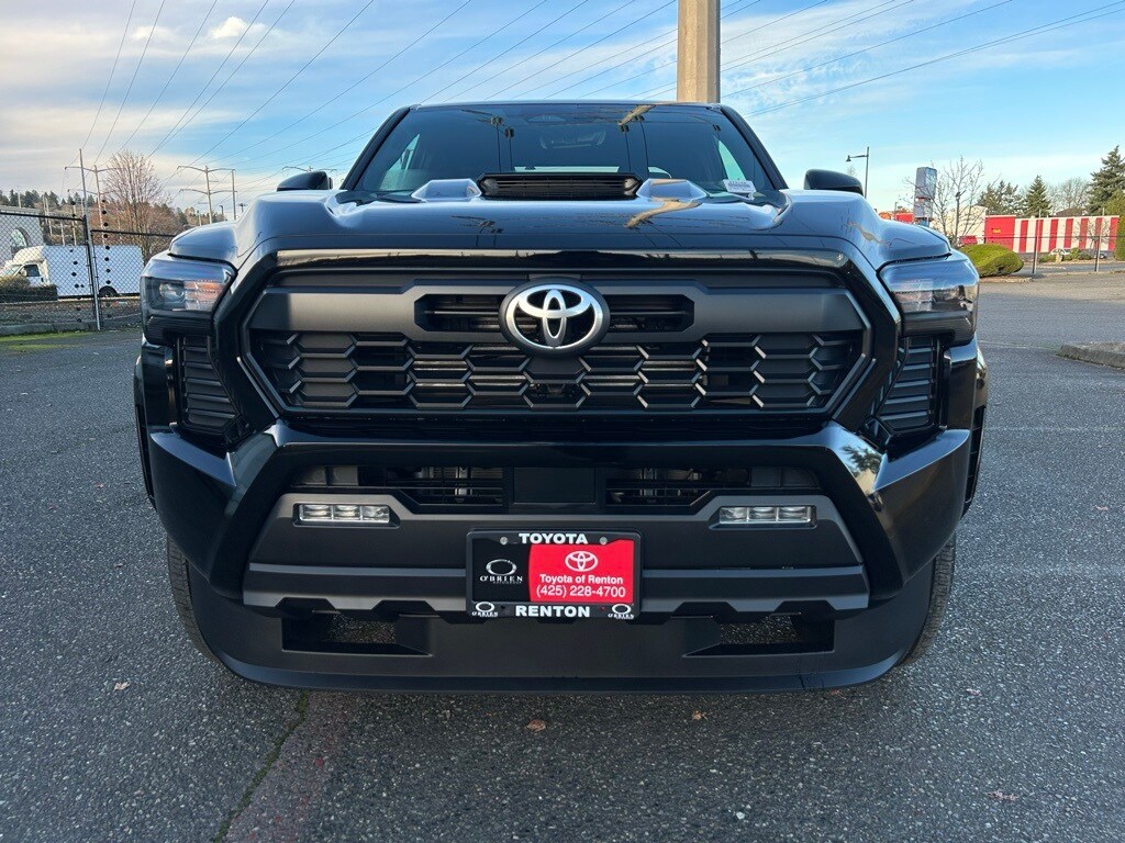 3.583 Axle Ratio, 4-Wheel Disc Brakes, 6 Speakers, ABS brakes, Air Conditioning, All Weather Floor Liners (TMS), Alloy wheels, AM/FM radio: SiriusXM, Anti-whiplash front head restraints, Apple CarPlay/Android Auto, Auto High-beam Headlights, Auto-dimming Rear-View mirror, Automatic temperature control, Brake assist, Bumpers: body-color, Driver door bin, Driver vanity mirror, Dual front impact airbags, Dual front side impact airbags, Electronic Stability Control, Emergency communication system: Safety Connect (1-year trial), Exterior Parking Camera Rear, Fabric Seat Trim, Four wheel independent suspension, Front anti-roll bar, Front Bucket Seats, Front Center Armrest, Front fog lights, Front reading lights, Fully automatic headlights, Heated door mirrors, Heated Seats, Illuminated entry, JBL Premium Audio, Knee airbag, Leather Shift Knob, Leather steering wheel, Low tire pressure warning, Mudguards (TMS), Occupant sensing airbag, Outside temperature display, Overhead airbag, Overhead console, Panic alarm, Passenger door bin, Passenger vanity mirror, Power door mirrors, Power steering, Power windows, Radio: 8" Toyota Audio Multimedia, Rear step bumper, Rear window defroster, Remote keyless entry, Security system, SofTex Seat Trim, Speed control, Speed-sensing steering, Split folding rear seat, Steering wheel mounted audio controls, Tachometer, Telescoping steering wheel, Tilt steering wheel, Traction control, TRD Sport Package, Trip computer, Turn signal indicator mirrors, Variably intermittent wipers, Wheels: 18" TRD Sport Alloy.2025 Toyota Tacoma TRD Sport Black 4WD 8-Speed Automatic 2.4L 4-Cylinder