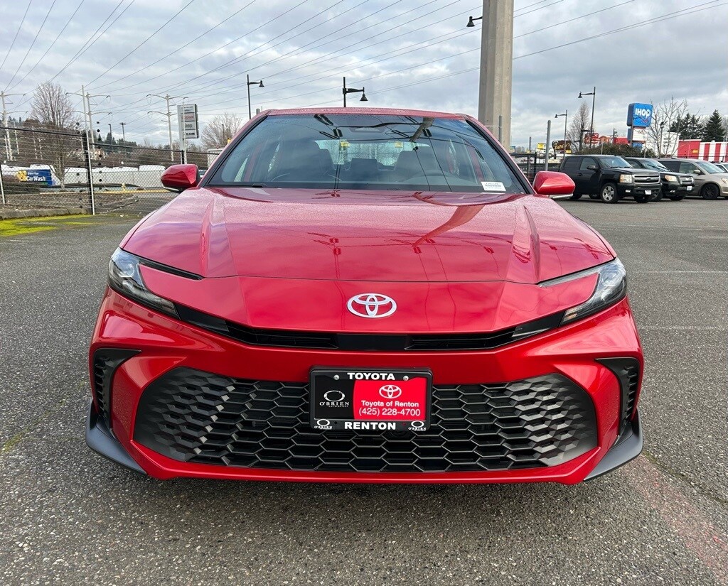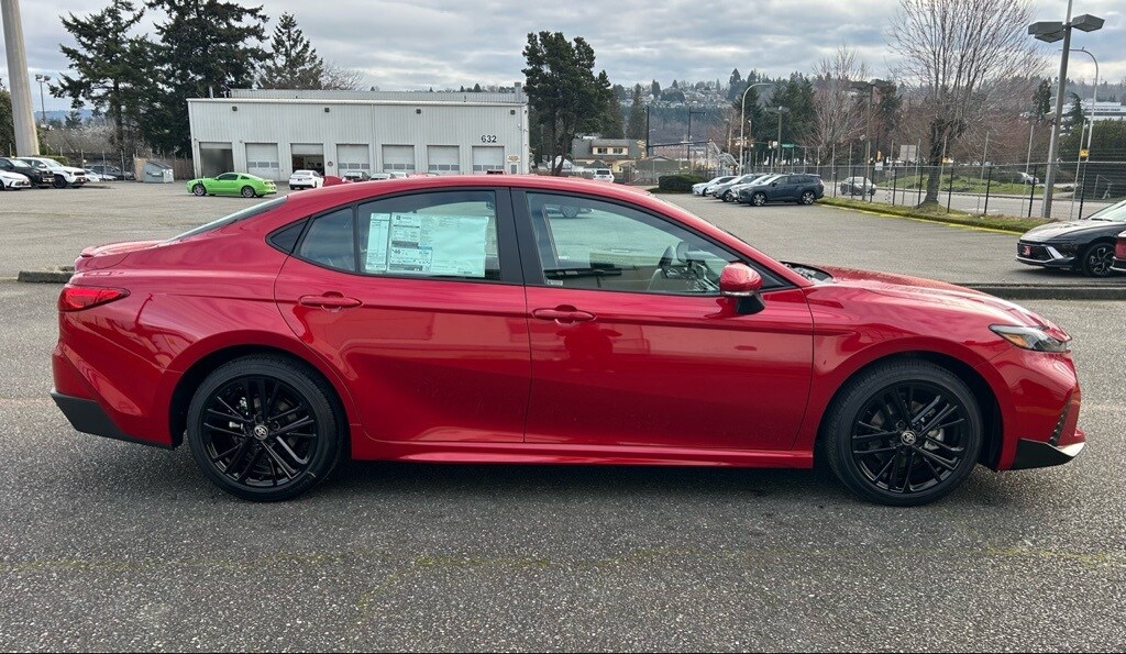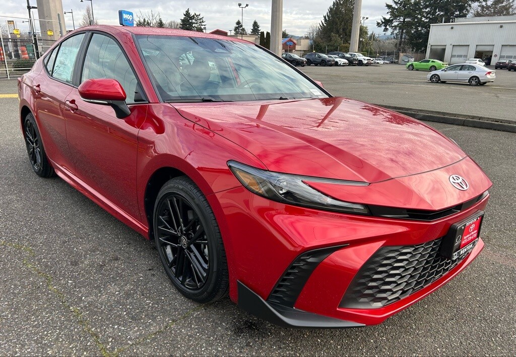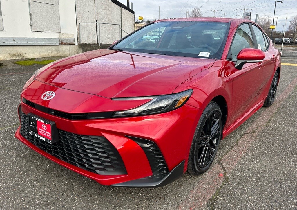 4-Wheel Disc Brakes, 6 Speakers, ABS brakes, Air Conditioning, All Weather Floor Protection, Alloy wheels, AM/FM radio: SiriusXM, Apple CarPlay/Android Auto, Auto High-beam Headlights, Auto-Dimming Rearview Mirror with HomeLink, Automatic temperature control, Brake assist, Bumpers: body-color, Cold Weather Package, Convenience Package, Delay-off headlights, Driver door bin, Driver vanity mirror, Dual front impact airbags, Dual front side impact airbags, Electronic Stability Control, Emergency communication system: Safety Connect (5-year trial), Exterior Parking Camera Rear, Four wheel independent suspension, Front anti-roll bar, Front Bucket Seats, Front Center Armrest, Front dual zone A/C, Front reading lights, Front Seats, Fully automatic headlights, Heated door mirrors, Heated Front Seats, Heated Leather Steering Wheel with Paddle Shifters, Illuminated entry, Knee airbag, Leather Shift Knob, Leather steering wheel, Low tire pressure warning, Occupant sensing airbag, Outside temperature display, Overhead airbag, Overhead console, Panic alarm, Passenger door bin, Passenger vanity mirror, Power door mirrors, Power driver seat, Power steering, Power windows, Radio data system, Radio: 12.3" Toyota Multimedia Audio, Radio: 8" Toyota Audio Multimedia, Rear anti-roll bar, Rear reading lights, Rear seat center armrest, Rear window defroster, Remote keyless entry, Security system, Smart Key System on Front Doors, SofTex and Fabric Seat Trim, Speed control, Speed-sensing steering, Split folding rear seat, Spoiler, Steering wheel mounted audio controls, Telescoping steering wheel, Tilt steering wheel, Traction control, Trip computer, Turn signal indicator mirrors, Variably intermittent wipers, Wheels: 18" Multi-Spoke Black-Finished Alloy.2026 Toyota Camry SE Red FWD eCVT 2.5L 4-Cylinder 16V DOHCRecent Arrival! 48/47 City/Highway MPG