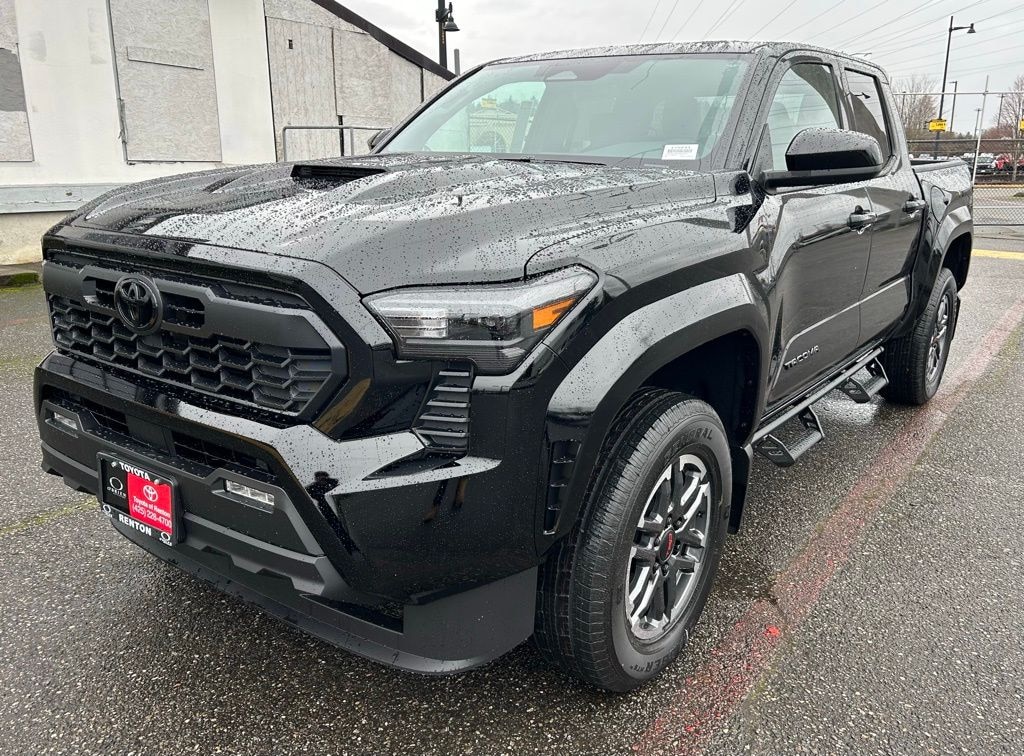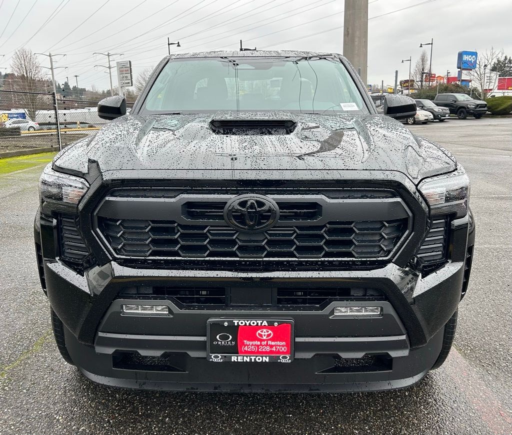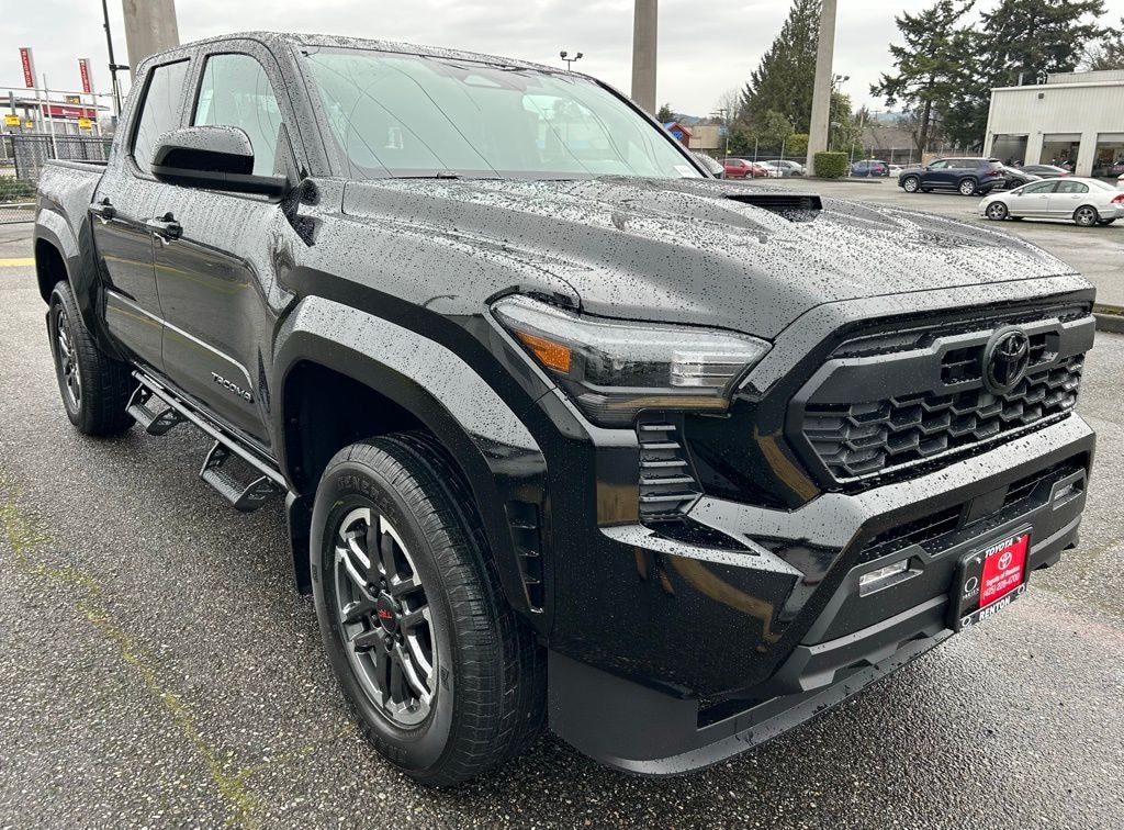 3.583 Axle Ratio, 4-Wheel Disc Brakes, 6 Speakers, ABS brakes, Air Conditioning, All Weather Floor Liners, Alloy wheels, AM/FM radio: SiriusXM, Anti-whiplash front head restraints, Apple CarPlay/Android Auto, Auto High-beam Headlights, Auto-dimming Rear-View mirror, Automatic temperature control, Black Tailgate Insert, Brake assist, Bumpers: body-color, Door Panel Scuff Protector, Driver door bin, Driver vanity mirror, Dual front impact airbags, Dual front side impact airbags, Electronic Stability Control, Emergency communication system: Safety Connect (up to 10-year trial subscription), Exterior Parking Camera Rear, Fabric Seat Trim, Four wheel independent suspension, Front anti-roll bar, Front Bucket Seats, Front Center Armrest, Front fog lights, Front reading lights, Fully automatic headlights, Heated door mirrors, Heated Seats, Illuminated entry, JBL Premium Audio, Knee airbag, Leather Shift Knob, Leather steering wheel, Low tire pressure warning, Mudguards, Occupant sensing airbag, Outside temperature display, Overhead airbag, Overhead console, Panic alarm, Passenger door bin, Passenger vanity mirror, Power door mirrors, Power steering, Power windows, Radio: 8" Toyota Audio Multimedia, Rear step bumper, Rear window defroster, Remote keyless entry, Removable Predator Step, Security system, SofTex Seat Trim, Speed control, Speed-sensing steering, Split folding rear seat, Steering wheel mounted audio controls, Tachometer, Telescoping steering wheel, Tilt steering wheel, Traction control, TRD Sport Package, Trip computer, Turn signal indicator mirrors, Variably intermittent wipers, Wheel Locks, Wheels: 18" TRD Sport Alloy.2026 Toyota Tacoma TRD Sport Black 4WD 8-Speed Automatic 2.4L 4-Cylinder