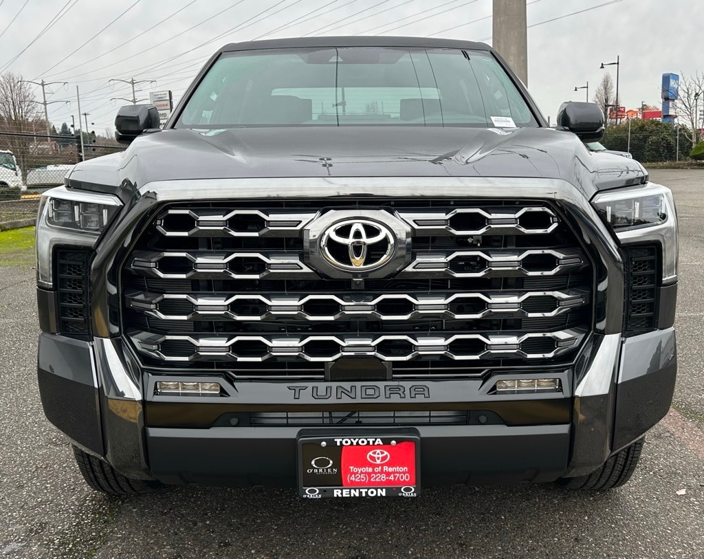 10" Color Head-Up Display (HUD), 12 Speakers, 3.31 Axle Ratio, 4-Wheel Disc Brakes, ABS brakes, Air Conditioning, All Weather Floor Liners, Alloy wheels, AM/FM radio: SiriusXM, Apple CarPlay/Android Auto, Auto High-beam Headlights, Auto-dimming door mirrors, Auto-dimming Rear-View mirror, Automatic temperature control, Black Front Bumper Letters, Brake assist, Bumpers: body-color, Center Console Safe, Compass, Delay-off headlights, Driver door bin, Driver vanity mirror, Dual front impact airbags, Dual front side impact airbags, Electronic Stability Control, Emergency communication system: Safety Connect (up to 10-year trial subscription), Exterior Parking Camera Rear, Front anti-roll bar, Front Bucket Seats, Front Center Armrest, Front dual zone A/C, Front fog lights, Front reading lights, Front wheel independent suspension, Fully automatic headlights, Garage door transmitter: HomeLink, Heated and Ventilated Front Bucket Seats, Heated door mirrors, Heated front seats, Heated rear seats, Heated steering wheel, Illuminated entry, Knee airbag, Leather Shift Knob, Leather steering wheel, Low tire pressure warning, Memory seat, Multimedia Glass Screen Protector, Navigation system: Drive Connect Cloud Navigation (1-year trial subscription), Occupant sensing airbag, Outside temperature display, Overhead airbag, Overhead console, Panic alarm, Passenger door bin, Passenger vanity mirror, Power door mirrors, Power driver seat, Power moonroof, Power passenger seat, Power Running Boards, Power steering, Power windows, Premium Leather Seat Trim, Radio data system, Radio: Premium Audio with JBL, Rain sensing wipers, Rear reading lights, Rear seat center armrest, Rear step bumper, Rear window defroster, Remote keyless entry, Security system, Speed control, Speed-sensing steering, Speed-Sensitive Wipers, Split folding rear seat, Steering wheel memory, Steering wheel mounted audio controls, Tachometer, Tailgate Insert - Black, Telescoping steering wheel, Tilt steering wheel, Traction control, Tri-Fold Tonneau Cover, Trip computer, Turn signal indicator mirrors, Variably intermittent wipers, Ventilated front seats, Ventilated rear seats, Voltmeter, Wheel Locks, Wheels: 20" Dark-Painted Alloy.2026 Toyota Tundra Hybrid Platinum Gray 4WD 10-Speed Automatic 3.4L V6